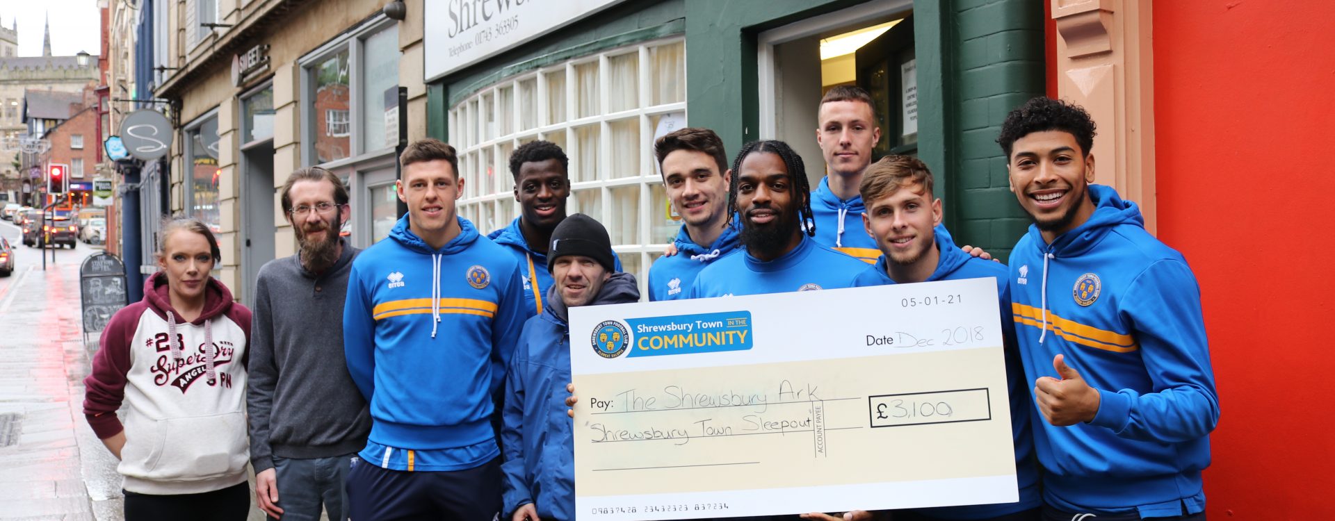 The players delivered food prepared by the club to the Shrewsbury Ark, which will be distributed among the clients who visit over the coming days. They then spoke to Tim, who runs the Ark, to find out some more about the kinds of people the Ark help and how they carry out their work. Along with this, they presented the Ark with a cheque for the £3,100 which was raised through out Sleepout Event held earlier in the year.